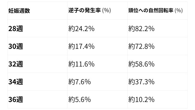 妊娠週数が進むほど、赤ちゃんの回転するスペースが狭くなり、逆子が戻る確率は下がっていきます。